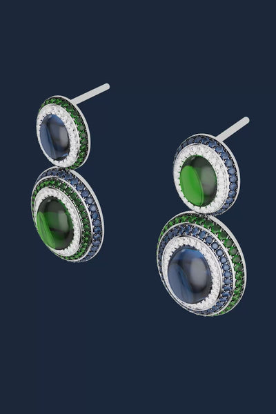 Perhiasan menawan ini bertatahkan batu berwarna hijau terang dan biru nil yang memadukan kecanggihan dan estetika yang tajam. Cahaya bersinar melaluinya, menghasilkan kesan yang berseri-seri.