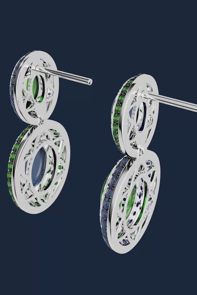 Perhiasan menawan ini bertatahkan batu berwarna hijau terang dan biru nil yang memadukan kecanggihan dan estetika yang tajam. Cahaya bersinar melaluinya, menghasilkan kesan yang berseri-seri.